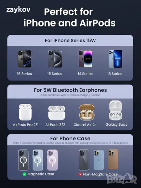Двойно зареждане на устройства: Съвместим с iPhone 16/15/14/13/12 серия и AirPods 3/2/Pro. Зареждайте своя iPhone и AirPods едновременно с нашата станция за зареждане 2 в 1, намалявайки бъркотията с кабели и поддържайки бюрото ви чисто и организирано.