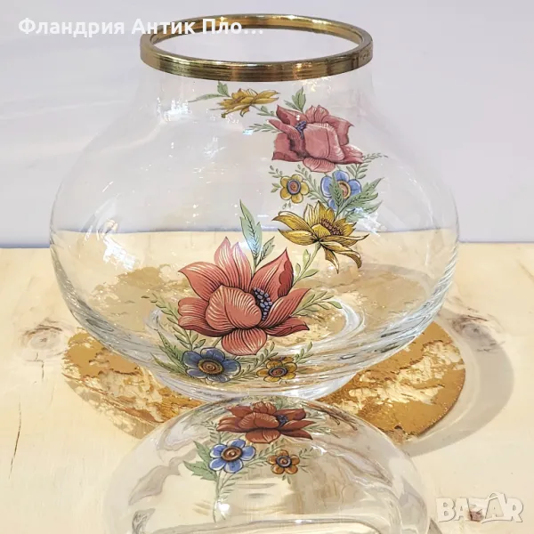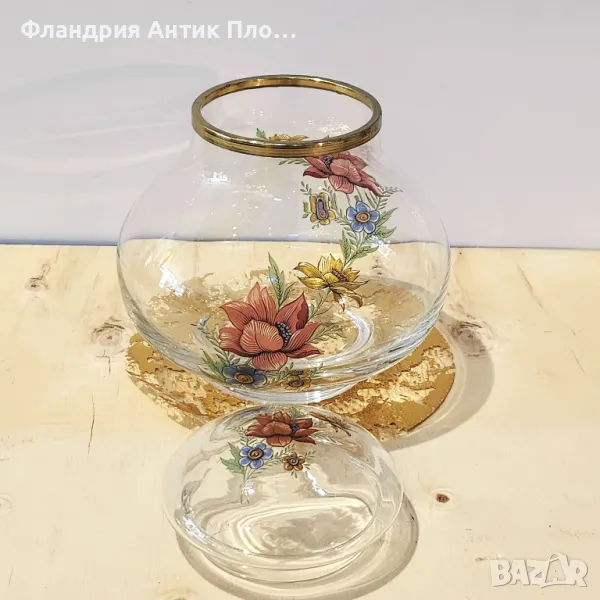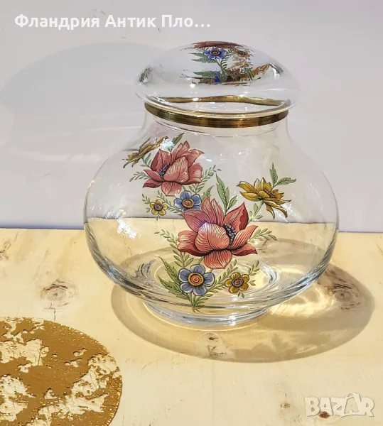 Изключително елегантен стъклен съд с капак, украсен с нежна ръчно изрисувана цветна композиция. Фините детайли на флоралния мотив и стилният месингов кант добавят винтидж чар и непреходна красота. Подходящ както за съхранение на любими лакомства и вещи, така и като красив декоративен акцент, който ще внесе свежест и романтика във вашия интериор.