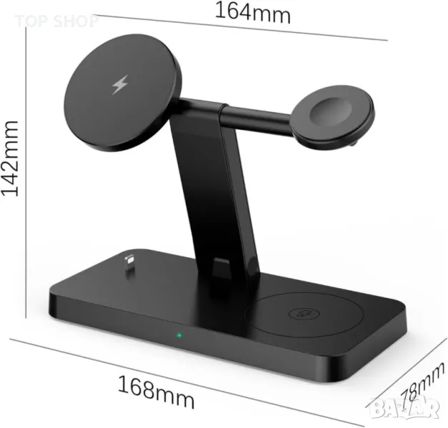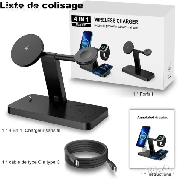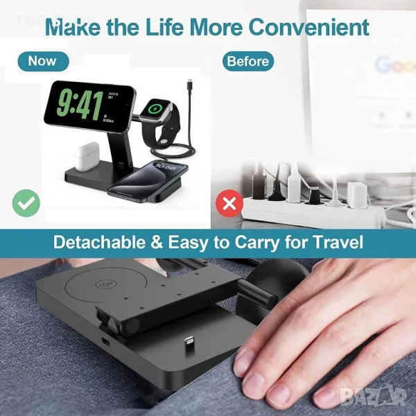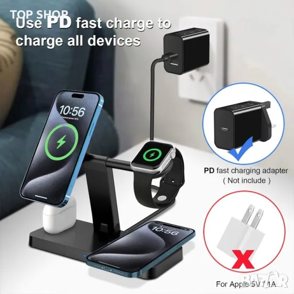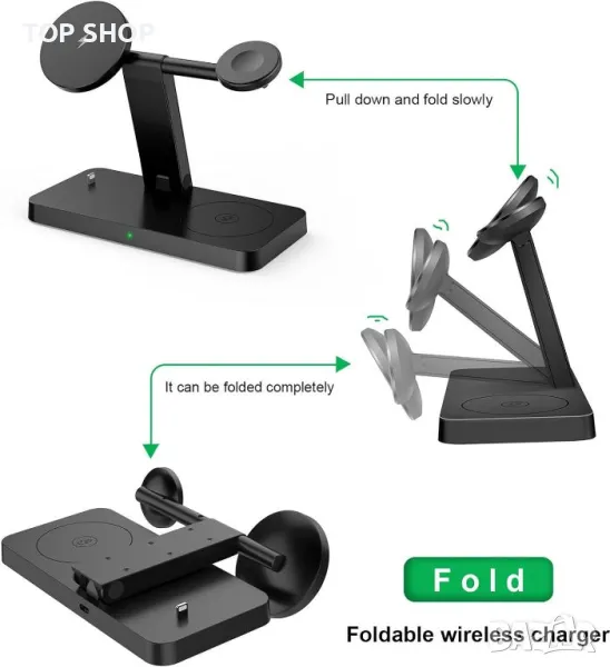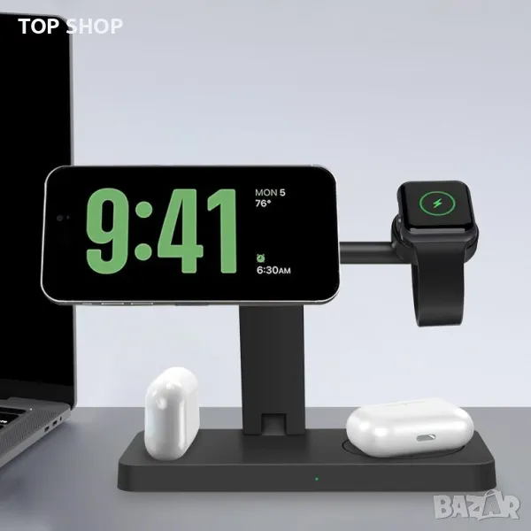 Тази стойка - зарядно устройство 4-в-1 MagSafe ефективно зарежда вашия iPhone, iWatch и AirPods едновременно, докато прецизно управлява излишните кабели, за да спести място. Поддържа до 15 W бързо зареждане за iPhone модели от серия 12 до 15, 5 W за AirPods и 2,5 W за iWatch, със силна препоръка да използвате 9V/12V 18W адаптер за оптимална производителност (адаптерът не е включен). Стойката е универсална съвместима с повечето устройства на Apple, използва мощни вградени магнити за сигурно, прецизно подравняване на зареждането и е сгъваема за преносимост. Освен това предпазва устройствата от често срещани електрически заплахи, осигурявайки безопасно изживяване при зареждане. Пакетът се доставя с USB-C кабел и ръководство за потребителя, но имайте предвид, че не е съвместим с калъфи, които не са MagSafe.