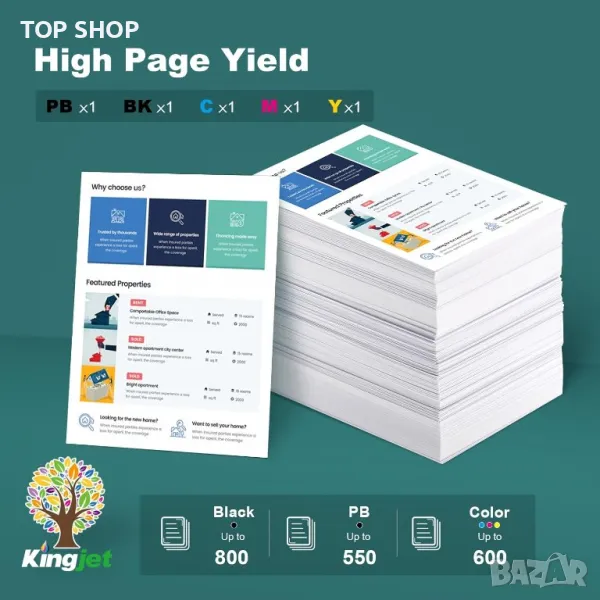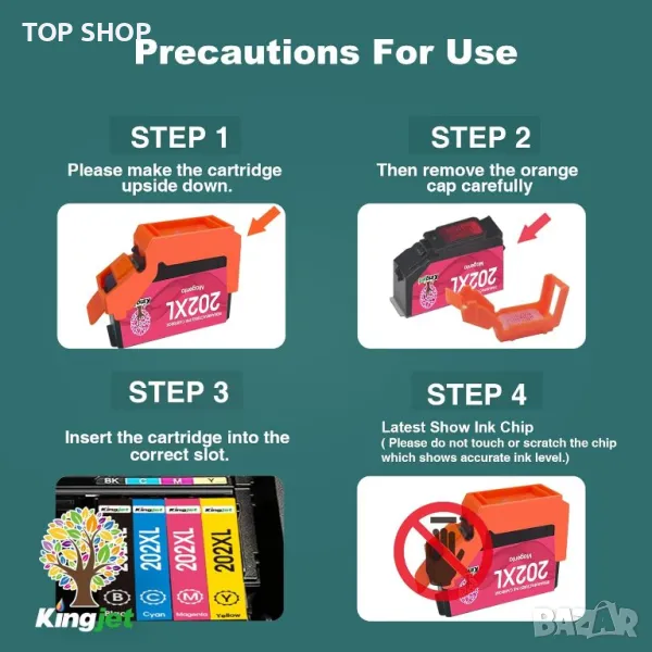 Моля използвайте системата за съобщения! Просто изпратете запитване. По телефона се губи време за уточняването на търсения от Вас продукт.Тези съвместими касети с мастило за принтер са преработени за Epson 202 202XL и са предназначени за използване с принтери Epson Expression Premium XP-6000, XP-6005, XP-6100, XP-6105 и XP-6001. Те включват най-новите подобрени чипове за перфектна съвместимост с маркови принтери, качествено мастило на базата на багрила за живи и ясни разпечатки на важни снимки и документи и висок капацитет, който ви позволява да печатате повече за по-малко. Капацитетът на страниците е приблизително 800 страници за касета с черно мастило 202XL и 600 страници за касета с цветно мастило 202XL при 5% покритие на хартия A4. Пакетът съдържа 5 броя касети (1x 202XL черна, 1x 202XL фото черна, 1x 202XL циан, 1x 202XL магента, 1x 202XL жълта) и ръководство. Бъдете сигурни, всяка касета с мастило Kingjet 202XL е напълно тествана и е сертифицирана по ISO9001, ISO14001 и Rohs за гарантиране на качеството.