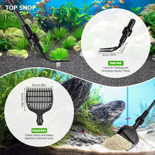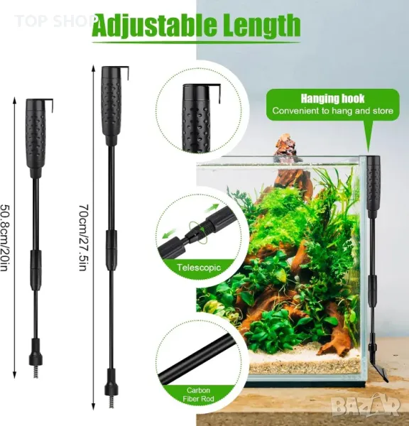 Този комплект за почистване на аквариум 6 в 1 включва стъргалка за водорасли, четка за гъби, твърда четка, мрежа за риба, вилица за растения и гребло за чакъл за ефективна поддръжка. Регулируемата дръжка от въглеродни влакна се простира от 50,8 до 70 см, осигурявайки гъвкавост за резервоари с различни размери, като същевременно остава лека и издръжлива. Вградена кука за окачване осигурява удобно съхранение и бърз достъп. Проектиран за използване както в сладка, така и в солена вода, неговата здрава, но лека конструкция е устойчива на огъване и износване. Безопасен за водните обитатели, той ефективно почиства, без да безпокои рибите, растенията или субстратите, като помага за поддържането на здравословна среда в аквариума.