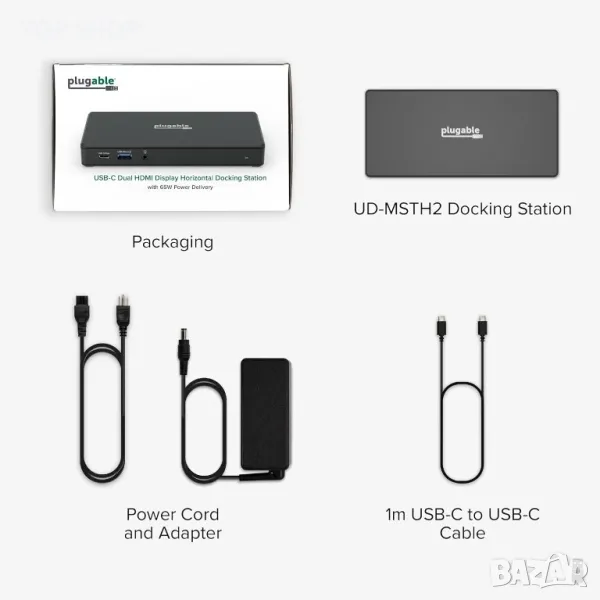 Plugable USB C докинг станция с 2 HDMI порта 4K 60Hz,65W,1xUSB-C,3xUSB