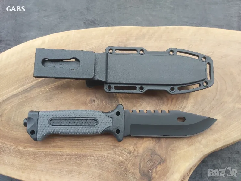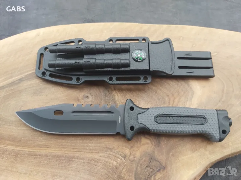 нож от висококачествена неръждаема стомана 440С със здраво и надеждно острие.Ножът е снабден със сигурен кобур със закачалка за колан.На кобура има поставен компас,както и запалка със свирка и точило за заточване на ножа.