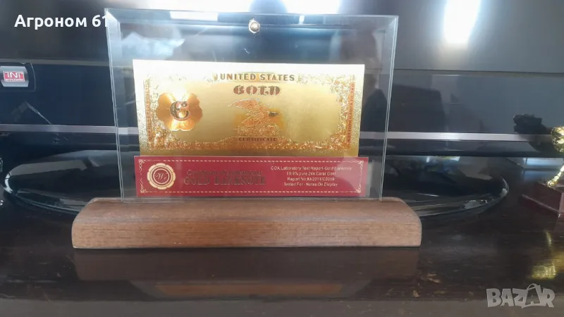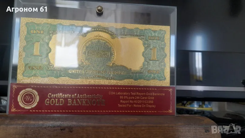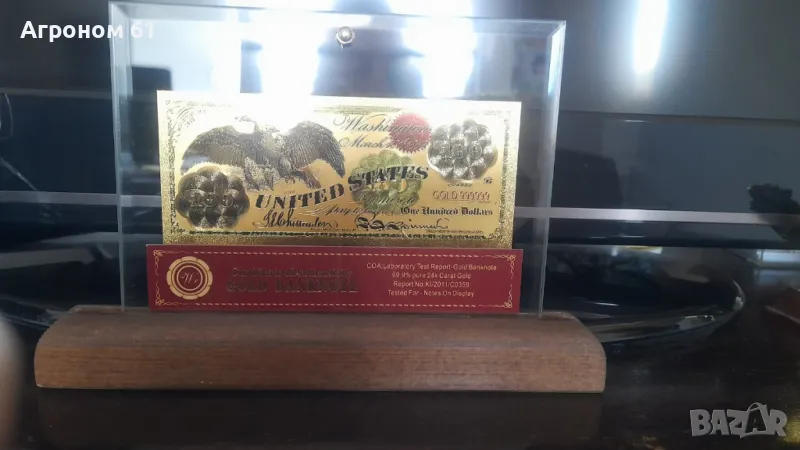 Златни банкноти изработени от златно фолио с чистота 24к и горещо пресована със специален поликарбонат за здравина и устойчивост поставена в стъклена поставка идеални за подарък или сувенир