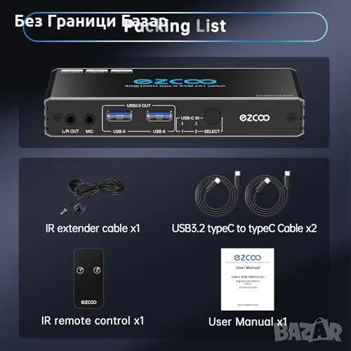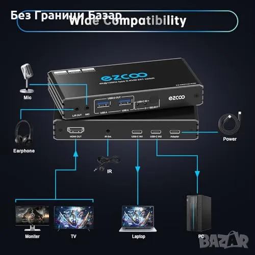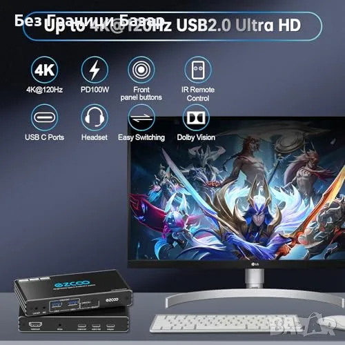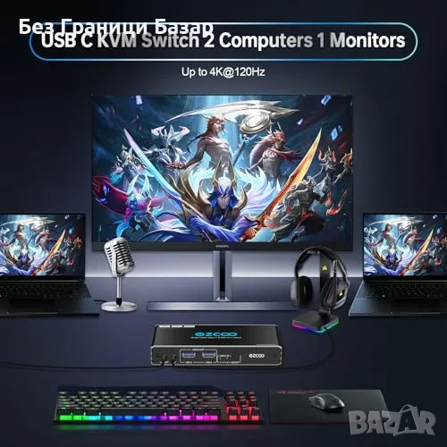 Нов KVM Превключвател 2 Лаптопа 1 Монитор 4K 120Hz USB-C HDMI 2.1