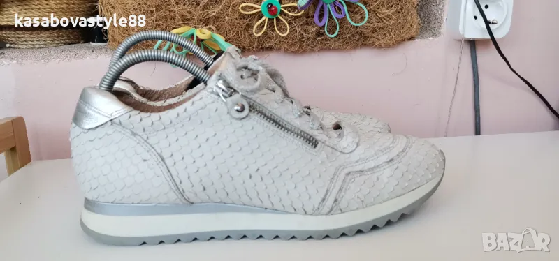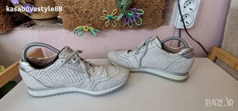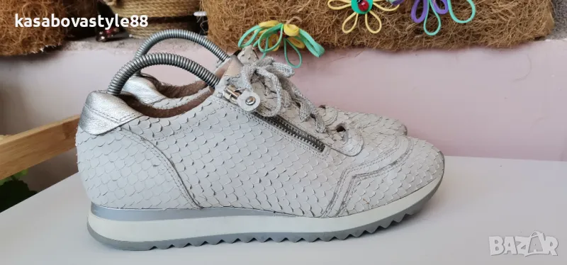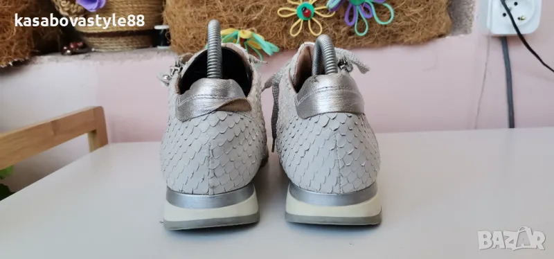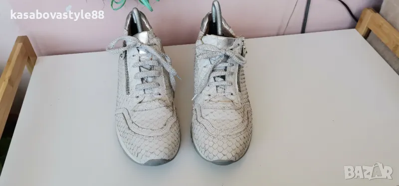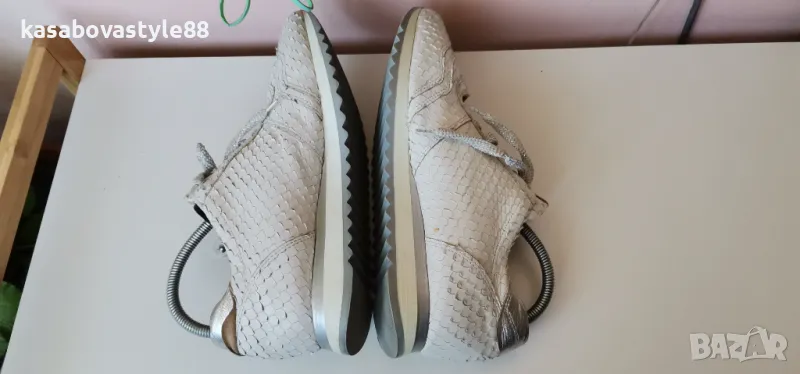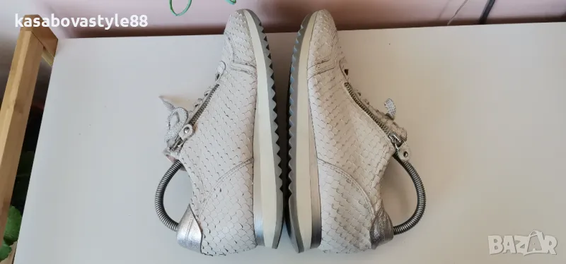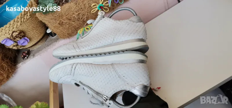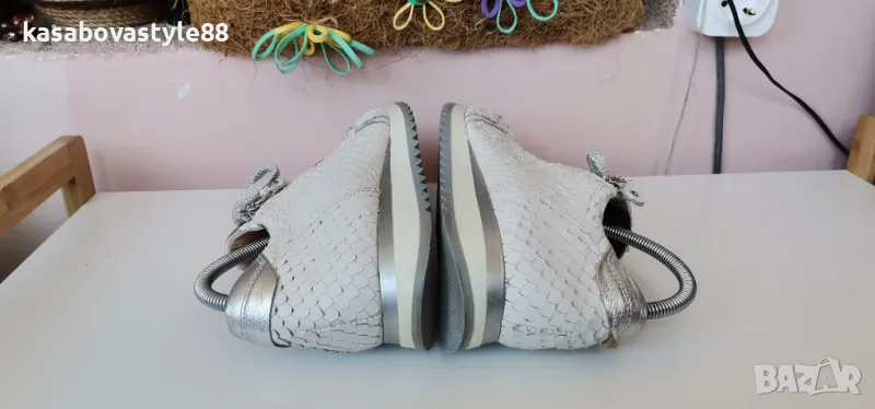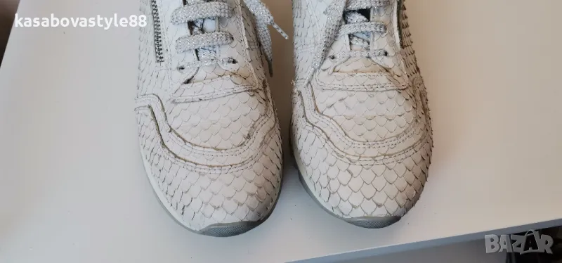 Дамски луксозни спортни обувки от висококачествена естествена кожа в бял цвят с ефектна щампа и елементи в сребристо. Моделът разполага с ципове и връзки, които ги правят лесни за обуване.Те изглеждат страхотно и гарантират много комфорт и удобство при носене. Дължина на стелка 26.3см.Ходило 2см.Цялостна височина отзад 9.5см.