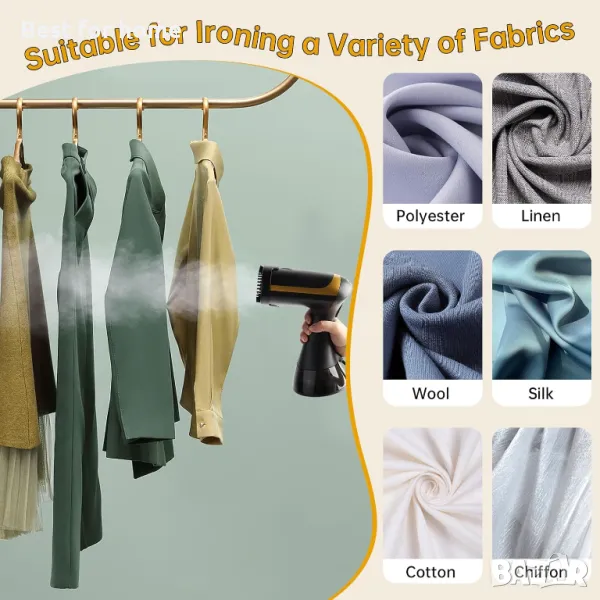 - [Широко използван във всички тъкани] - Преносимият параход е идеалният спътник за личен живот и бизнес пътувания. Подходящ е за дрехи, завеси, мебели, играчки и много други. Освен облекло, може да освежи и много предмети в дома, като завивки, пердета, калъфки за възглавници и др.