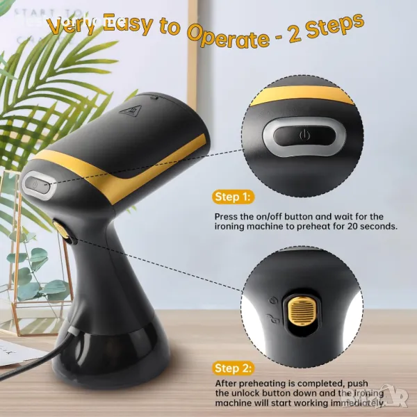 - [Лесен за използване] - Подобреният дизайн на дюзата от неръждаема стомана на парната ютия гарантира, че няма да изтече или да се разлее. Можете да го използвате под всякакъв ъгъл, за да изпарите хоризонтално или вертикално окачени дрехи. Плоско гладене и висящо гладене 2 в 1. Универсална и ефективна парна ютия за дрехи.
