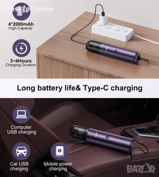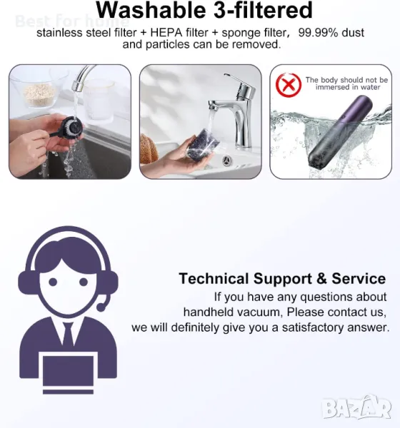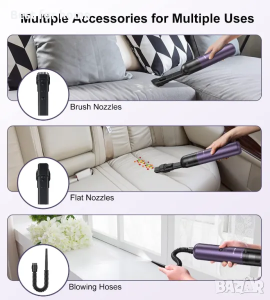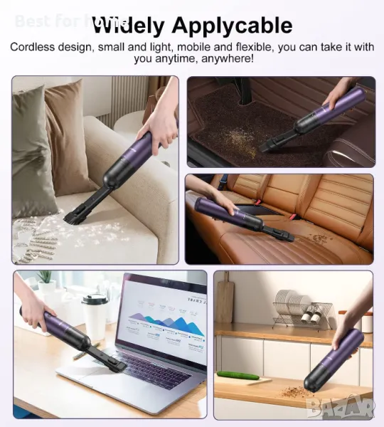 【𝐖𝐢𝐝𝐞𝐥𝐲 𝐀𝐩𝐩𝐥𝐲𝐜𝐚𝐛𝐥𝐞】Прах навсякъде, пясък в колата, конфети на масата, трохи от хляб в кухнята, косми от домашни любимци и други могат лесно да бъдат решени! Безжично дизайн, малък и лек, мобилен и гъвкав, можете да го вземете със себе си по всяко време и навсякъде!【𝐌𝐮𝐥𝐭𝐢𝐩𝐥𝐞 𝐀𝐜𝐜𝐞𝐬𝐬𝐨𝐫𝐢𝐞𝐬 𝐟𝐨𝐫 𝐌𝐮𝐥𝐭𝐢𝐩𝐥𝐞 𝐔𝐬𝐞𝐬】 Аксесоарите за почистване включват дюзи за четки, дълги и плоски дюзи с прорези и маркучи за издухване, както и малки четки за почистване, разнообразие от аксесоари могат да отговорят на вашите различни нужди!【𝐋𝐨𝐧𝐠 𝐛𝐚𝐭𝐭𝐞𝐫𝐲 𝐥𝐢𝐟𝐞& 𝐓𝐲𝐩𝐞-𝐂 𝐜𝐡𝐚𝐫𝐠𝐢𝐧𝐠】Вградените 4 литиеви батерии от 2000mAh могат да осигурят дълго време за работа, само 3,5-4 часа при пълно зареждане. С включения USB-C кабел за зареждане можете да използвате USB слота за зареждане навсякъде в колата или дома ви.【𝐖𝐚𝐬𝐡𝐚𝐛𝐥𝐞 𝟑-𝐟𝐢𝐥𝐭𝐞𝐫𝐞𝐝】Използвайки филтър от неръждаема стомана + HEPA филтър + филтър с гъба, той може да филтрира отпадъците по-ефективно и да предпази високоскоростния мотор от удължете експлоатационния му живот. Всички филтри могат да се мият и да се използват многократно за дълбоко почистване с включената малка четка.