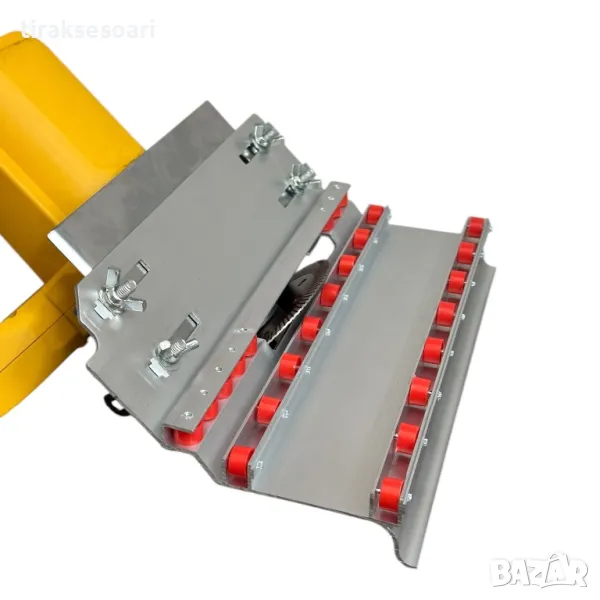 Към циркулярът е прикрепен инструмент който чрез помощта на 24 колелца се движи по ръба на плочката. Така се получава прав сряз под 45 градуса.