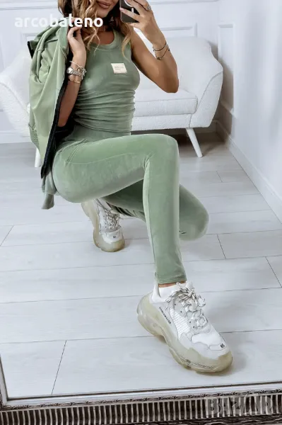 Велурен анцуг от три части е абсолютно задължителен в гардероба ви. Предлаганият при нас модел се състои от суичър с цип, вталена горна част с широки презрамки и клин с висока талия. Носете кадифения комплект самостоятелно или в комплект! Златната лепенка ще добави уникален характер към стайлинга.