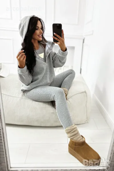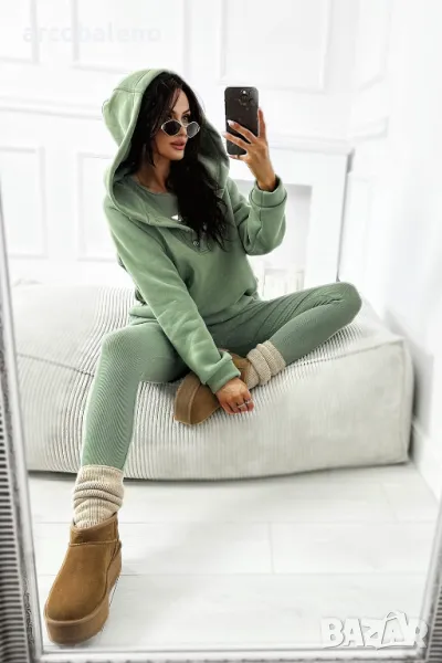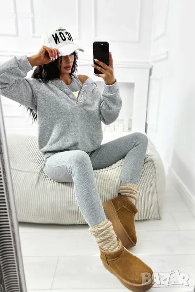 Комплект анцуг, състоящ се от изолиран oversize суичър с копчета, рипсен клин и горнище с декоративна пластина. Мегаудобна памучна материя - чудесна основа за спортен стайлинг!