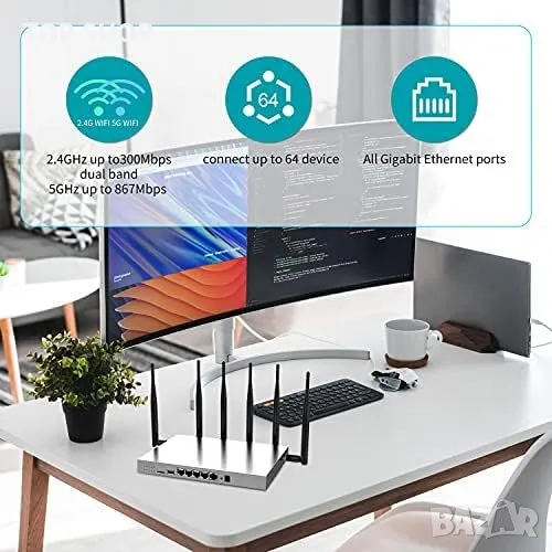 Двубандов WiFi: 300Mbps на 2.4GHz и 867Mbps на 5GHz.