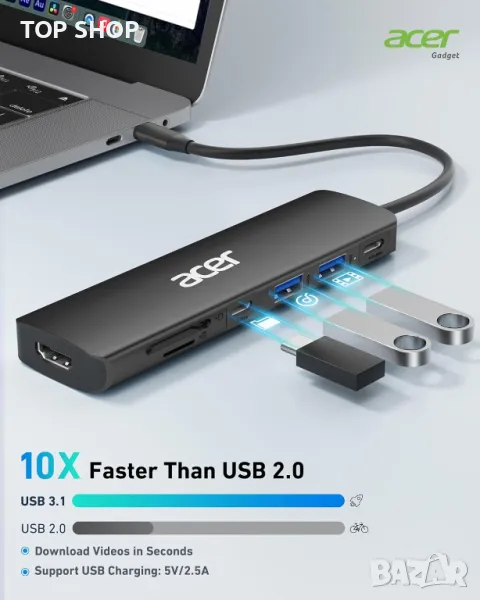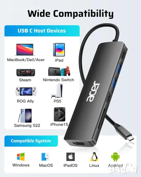 USB C сплитерът на Acer, изработен от здрав алуминий, разширява един USB-C порт до 7 порта: 1 HDMI (4K@30HZ), 2 USB 3.1, 1 USB-C, 1 Type-C PD зареждане, 1 слот за MicroSD карта и 1 слот за SD карта, идеален за подобряване на вашата работна настройка у дома, в офиса или в движение. С подаване на мощност от 100 W през PD порта за бързо зареждане тип C, той осигурява високоскоростно зареждане за лаптопи като MacBook Pro/Air и други USB-C устройства. Адаптерът 4K USB-C към HDMI позволява безпроблемно дублиране на екрана или разширение с потапяща 3D резолюция. Ефективното прехвърляне на данни до 5 Gbps се улеснява от два USB-A 3.1 порта и един USB-C порт, повишавайки ефективността на работа. Тази многофункционална докинг станция може да се похвали с широка съвместимост с различни лаптопи, включително модели на Acer, Macbook и други, заедно със съвместимост с Windows, ChromeOS, Linux и Mac OS X 10.5 или по-нови, което я прави универсално решение за различни настройки.