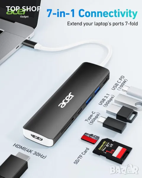 Acer USB C Hub, 7 в 1 USB C към 4K HDMI, 2 USB 3.1, Type-C, PD 100W, четец на SD карти