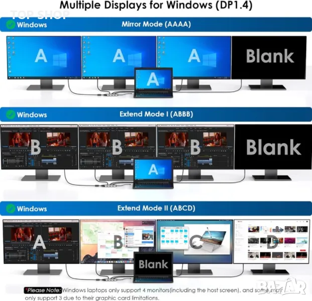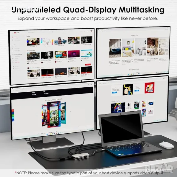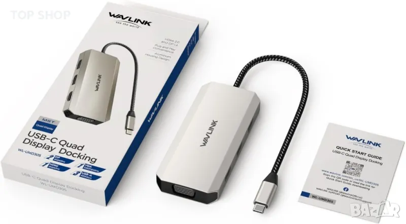 Моля използвайте системата за съобщения! Просто изпратете запитване. По телефона се губи време за уточняването на търсения от Вас продукт.Уверете се, че вашият компютър или смартфон има поне един USB-C порт, поддържащ режим DP Alt, преди да купите. За Windows OS разширете с 4 монитора (поддържат се MST и SST), докато MacOS ограничава разширяването до 4 допълнителни монитора, показващи същото съдържание. WAVLINK 7-в-1 USB C докинг станция разполага с 2x DP порта (4K@60Hz), 1x HDMI1 (4k@60Hz), 1x VGA порт (1080p@60Hz) и 3 x USB2.0 (до 480Mbps), подобряване на периферната свързаност и ефективността на работните станции. Насладете се на 4K Ultra HD видео изход с поддръжка на 2x DisplayPort и HDMI едновременно. Лесен трансфер на данни с три USB 2.0 порта, предлагащи скорости до 480Mbps. Съвместим с Thunderbolt 3/4 или USB C портове, поддържащи видео или DP Alt режим, и работи с Microsoft Windows 7/8/10/11, Apple Mac OS 10.8 или по-нова версия. Функцията Plug and play не изисква софтуер или драйвери за инсталиране. Включени: 1 x USB-C докинг станция, ръководство за бързо инсталиране.