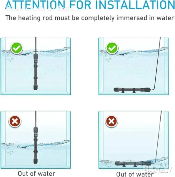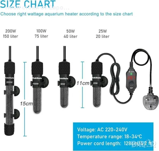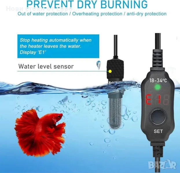 нагревател за аквариум YukiHalu, мини нагревател за аквариум 25W 50W 100W 200W вграден термометър, външен контролер на температурата, LED дисплей, използвани 20-150 литра (25W 20 литра), черен Натиснете бутона 'SET', за да регулирате температурата. Натиснете веднъж, температурата ще се повиши с 0,5 °C. Натиснете бутона няколко пъти, докато се достигне целевата стойност. Температурата може да се регулира точно от 18 до 34°C Без операция за 3 секунди, настройката се потвърждава, че е активирана Нагревателят започва да загрява. Светва червен индикатор Спрете нагряването автоматично при достигане на зададената температура. Зеленият индикатор свети. Автоматична постоянна температура с точност до 0,5°C. Нагревателят работи в режим на променлива честота въз основа на PID стратегия за управлениеE1: извън защита от вода. Захранването ще бъде прекъснато и отоплението ще спре автоматично, ако нагревателят напусне водата или нагревателят не се потопи напълно във водата. Показване на код за грешка „E1“. Нагревателят ще работи отново, ако се върне към вода. H1: Защита от прегряване. Захранването ще бъде прекъснато и отоплението ще спре автоматично, ако температурата на водата надвиши 36°C, Покажете код за грешка „H1“. Нагревателят ще работи отново, ако температурата на водата е под 34°C.