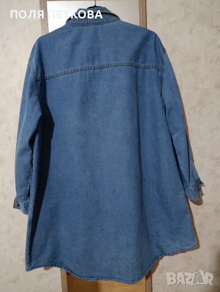 Дънкова риза дълга може да се носи и като рокля закопчана и като връхна дреха размер 3xl може да се носи и от по-малък размер гръдната 140 ханш150 цяла дължина 92 см памучна материя дънкова с еластан много лека и удобна