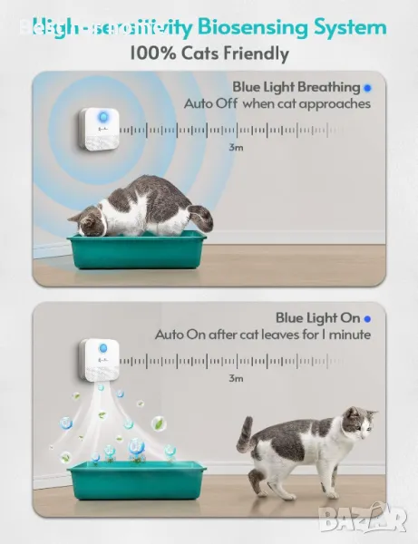 Принцип на работа и 100% подходящ за котки: Дезодорантът DownyPaws за котешка тоалетна отделя дезодориращи и намаляващи праха вещества (отрицателни йони), емисиите му са напълно в нормалните граници, което е приятелско за вас и вашата котка. В допълнение, дезодорантът е оборудван с чувствителна система за биочувствителност. Когато котката се доближи до дезодоранта, той автоматично се изключва и се включва автоматично, когато котката напусне къщата. Напълно безопасно!