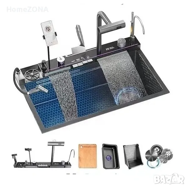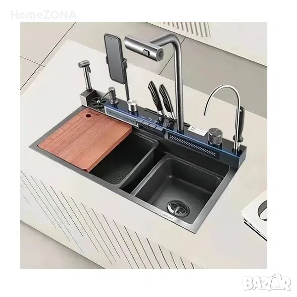 Мивка за кухня Spark е иновативно и практично решение за съвременната кухня. Съчетавайки висококачествена изработка и изчистен дизайн, този модел внася стил във всяко пространство. Мивка Spark ще ви изненада със своята мултифункционалсност и креативност със включена стойка за телефон, за да можете лесно и удобно да четете рецепти, гледате новини или слушате музика докато използвате мивката и допълнителни джобове за прибори и точило. Изработена е от висококачествена неръждаема стомана с Nano покритие, което я прави устойчива на отчупване, напукване или изгаряне, и осигурява години красота и надеждна работа.