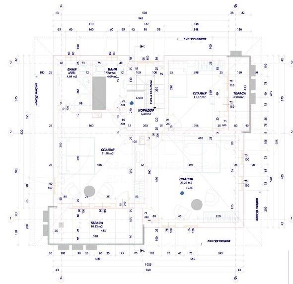 Втори етаж - три спални всяка с тераса, две бани и коридор.
