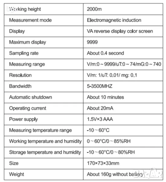 Материал: ABS - Обхват: Електрически: 0 ~ 2000mG; Магнитни: 0 ~ 200 - Разделителна способност: 1mG, 0.1μT - Тестова лента: 30Hz-300Hz