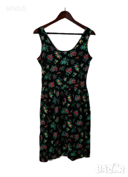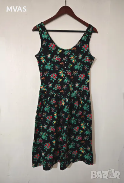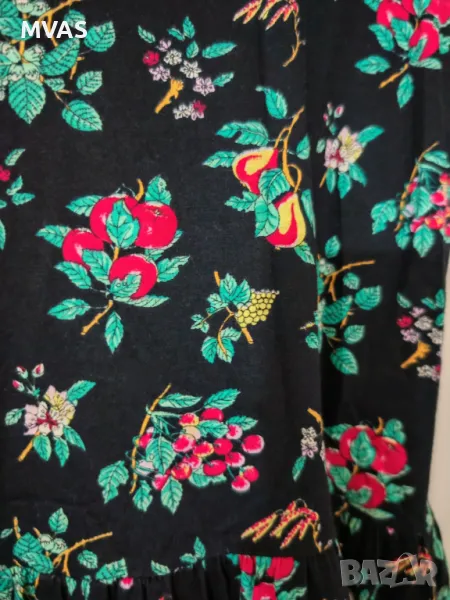 Нова лятна рокля. Черна с десен на плодчета зелени листа и червени плодчета. Декоративни копчета отпред. Вталена. Седи по тялото, надолу полата се разширява.