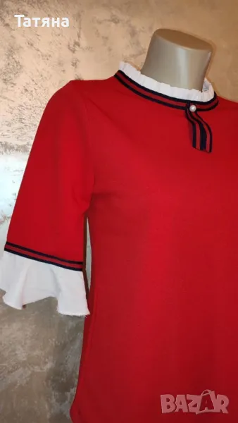Блузка, в червен цвят, с бял набор на ръкава от шифон, материята е полиестер, има еластичност, размер М- Л, обличана е само веднъж