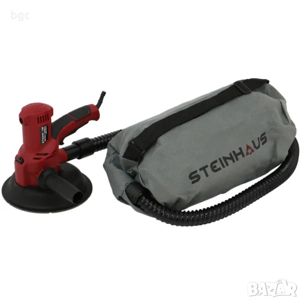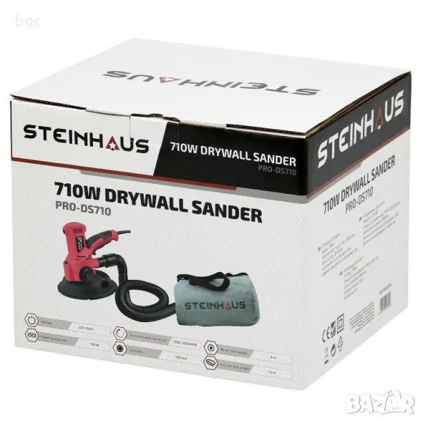 Шлайфмашината за сухи стени Steinhaus PRO-DS710 е предназначена за шлайфане на стени, премахва остатъци от мазилка, тапети, боя и др. Оборудвана е с мощен 710W мотор с 6 степени на променлива скорост, допълнителна ръкохватка с възможност за ляв/десен монтаж и пружинно закрепване за яката на дискодържача. Системата за засмукване на прах с колекторна торба осигурява чистота. Дългият 4 метра електрически кабел осигурява голям обхват на действие.