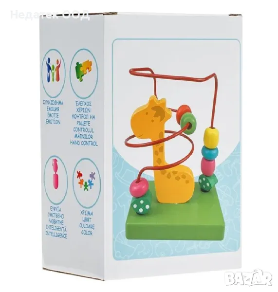 Дървена образователна играчка със зелена основа, с 1 тел, цветни дървени топки и жираф. Целта на играта е да преместите топките по телта, като следвате кривите и да достигнете от единия край до другия. Помага при координацията на ръцете, разпознаването на цветовете и възприемането на движенията.