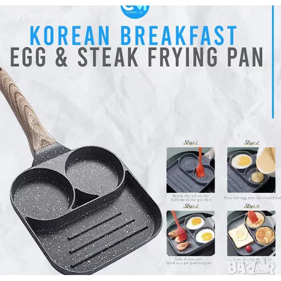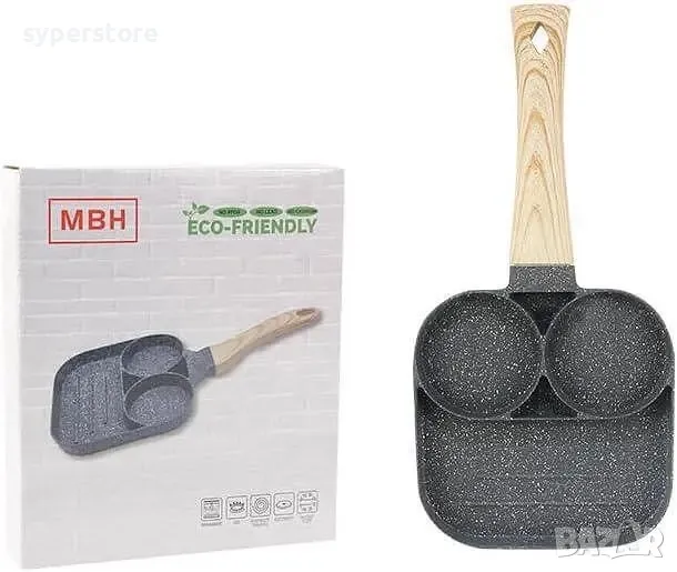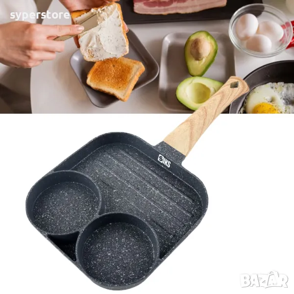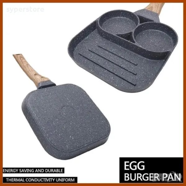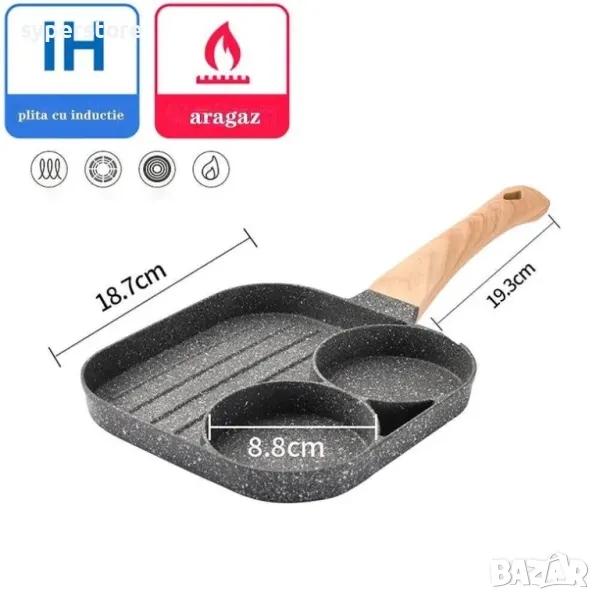 Тиган с незалепващо покритие с 2 отделения за омлет, яйца, палачинки и други, и едно по-гоямо отделение за грил, меса , зеленчуци и др.