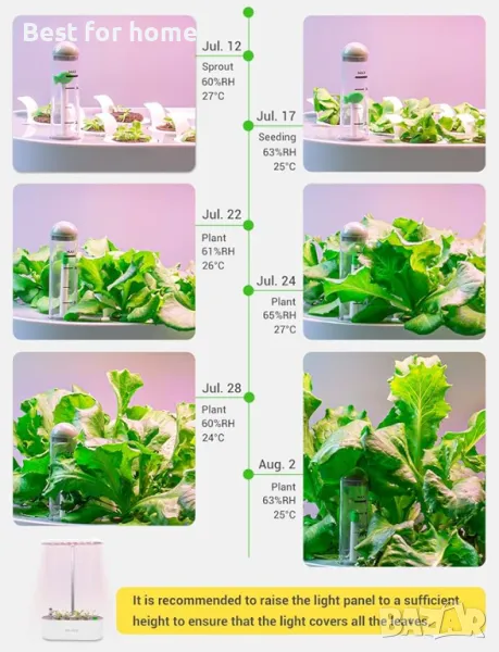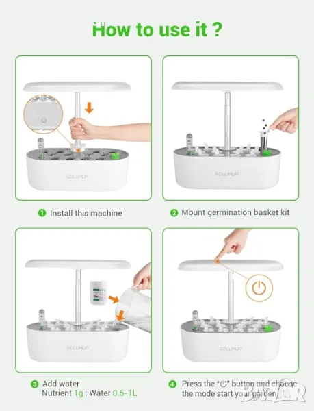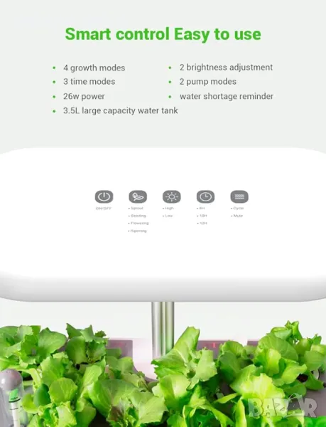4 РЕЖИМА НА РАСТЕЖ - Покълване, Засаждане, Цъфтеж, Зреене. Можете да изберете режима според различните етапи на растеж на вашите растения. За подробности, моля, вижте ръководството за потребителя.