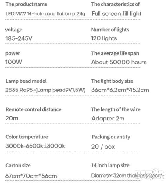 LED M666 14 инча 33см кръгла лампа с плосък панел 2.4G