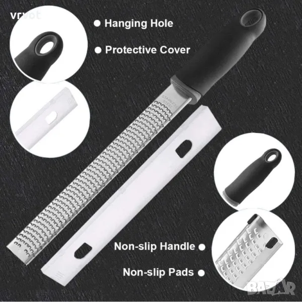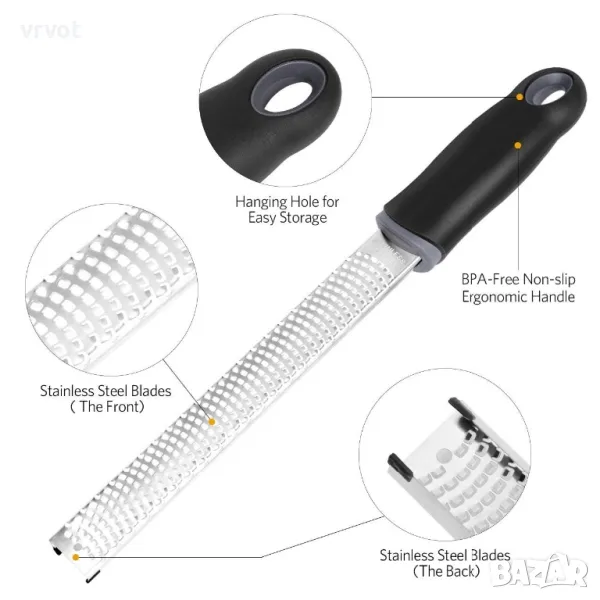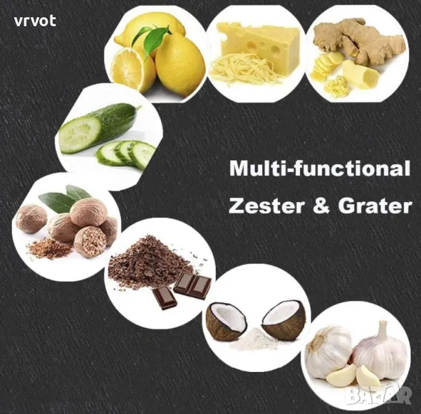 Множество функции - Zester и ренде, подходящи за повечето плодове и зеленчуци, като шоколад, джинджифил, чесън, сирене, краставица, картофи, моркови, пармезан, реджано, лимон, портокал, лайм и цитрусови плодове.