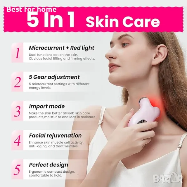 Оформете V-образно лице: Уредът за лифтинг на лице е подходящ за разкрасяване на цялото лице и шия, ефективно повдигане на мускулите на лицето и третиране на бръчки. Този инструмент за красота с микроток имитира естествения електрически ток на тялото, за да стимулира движението на мускулите, повдига контурите на брадичката и бузите и оформя V-образно лице