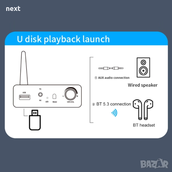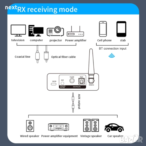 2. Универсален двоен режим: Като BT предавател и приемник „две в едно“, цифрово-аналоговият аудио конвертор позволява на аудио източници, които не са BT, като телевизори, компютри и проектори, да изпращат аудио към BT високоговорители и слушалки в режим TX, докато режимът RX му позволява да приема аудио от BT устройства и да го извежда към високоговорители, които не са BT, чрез AUX.