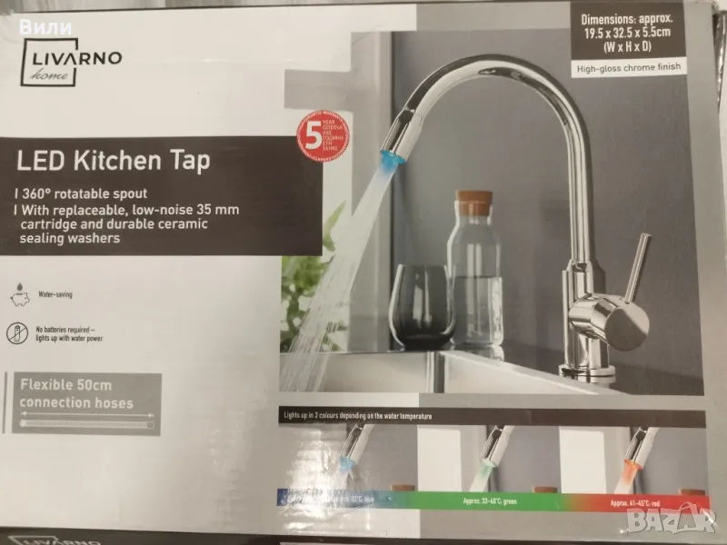 Кухненски LED смесител, 360 градуса завъртане, хромирано гланцово покритие, свети в 3 цвята в зависимост от температурата на водата: 32градуса синьо,33-40градуса зелено и 41-45 градуса червено, не са необходими батерии, свети под действието на водната струя, керамични шайби,гъвкави меки връзки 50 см, пълен комплект за монтаж. Ползван е 6 месеца. Сменен е поради промяна на визията на кухнята.