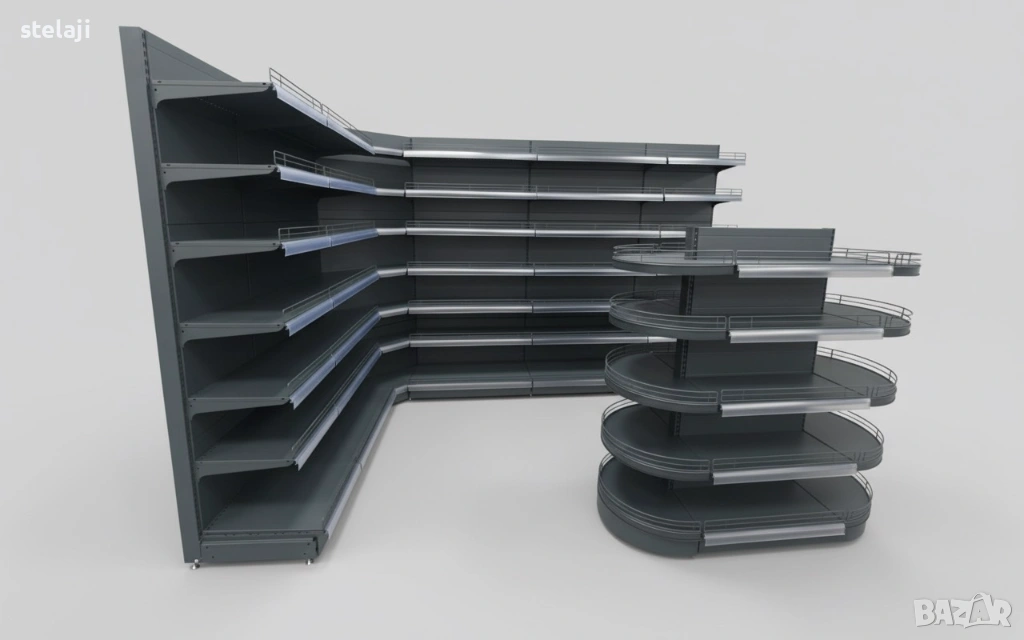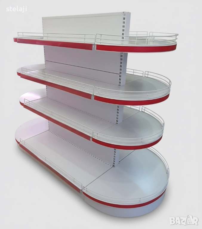 Островен стелаж за магазин със заоблени рафтове.