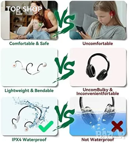 Дизайнът с отворени уши позволява на децата да слушат музика, като същевременно следят заобикалящата ги среда за по-голяма безопасност.