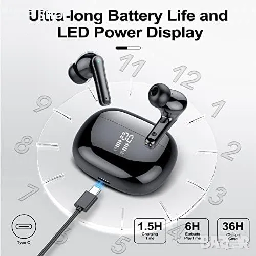 48 часа възпроизвеждане: 6 часа на заряд, кейс за зареждане с LED дисплей.