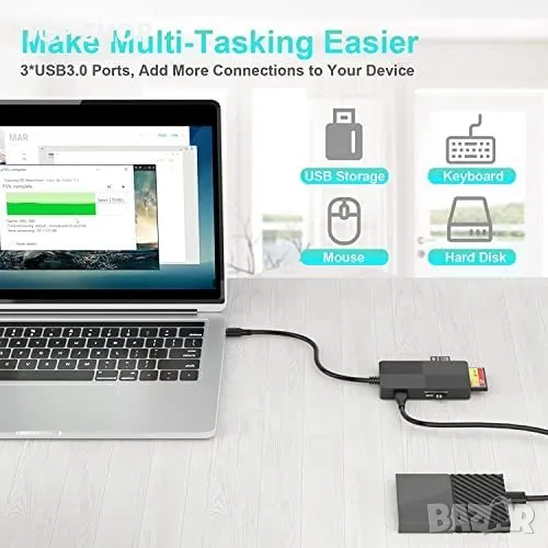 Хъб за четене на карти 8 в 1 с 5 слота за карти памет и 3 порта USB 3.0