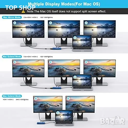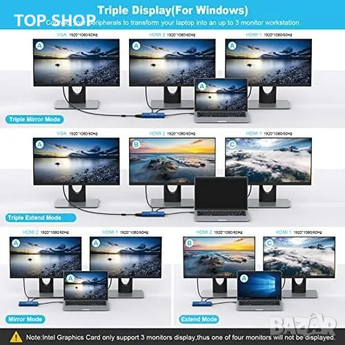 Поддържа троен дисплей с HDMI и VGA портове за огледално възпроизвеждане или разширяване на видеоклипове към външни монитори.