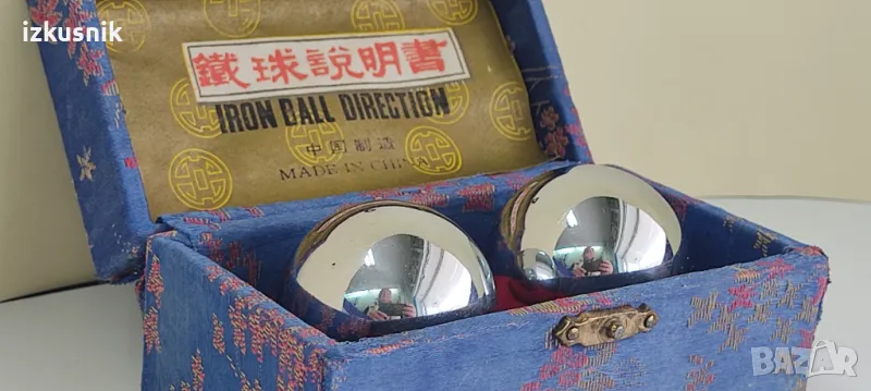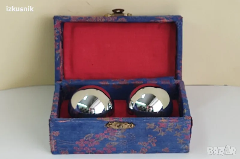 Винтидж китайски стоманени топки Baoding. Музикални, от 80-те години. В оригинална кутия, облечена с естествена коприна с традиционни мотиви.. С книжка за автентичност и указание за използване.