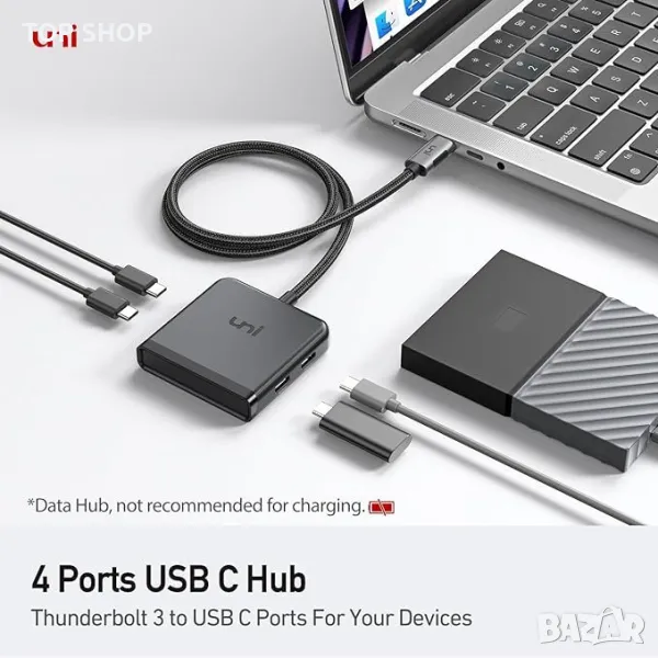 Моля използвайте системата за съобщения! Просто изпратете запитване. По телефона се губи време за уточняването на търсения от Вас продукт.Uni USB C хъб многопортовият адаптер разполага с 4 USB C порта с вграден OTG функционален чип за лесен трансфер на данни при 5Gbps, 10 пъти по-бързо от USB 2.0. Това е plug-and-play решение, което разширява USB-C/Thunderbolt 3 портовете на вашия компютър без никакви драйвери или адаптери. Хъбът е проектиран с мисъл за безопасността, оборудван с интелигентен чип за предотвратяване на свръхток, пренапрежение, късо съединение и прегряване. Той също така може да се похвали с издръжлив 2-футов гъвкав плетен найлонов кабел и широка съвместимост с различни USB Type-C устройства, което го прави идеален за пътуване и работна ефективност. Моля, имайте предвид, че той е предназначен за синхронизиране на данни и не поддържа зареждане.