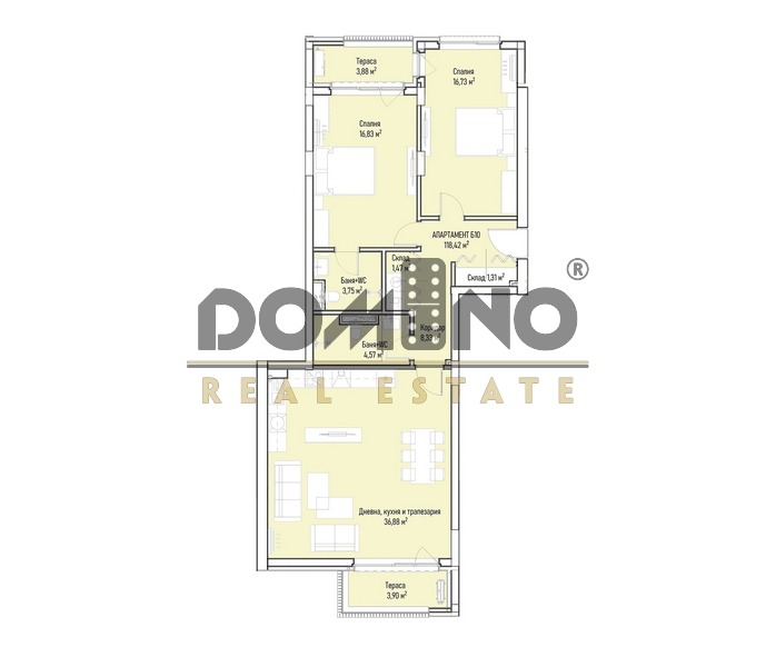 Изключително просторен, светъл, вътрешен, непреходен, тристаен апартамент с възможност за закупуване на паркомясто. В завършена нова сграда от инвеститор с дългогодишен опит и множество отличителни награди. Сградата е с модерна архитектура и представителни общи части. Собствен двор и детска площадка. Намира се на тихо място, близо до Бизнес парк София, детска градина, няколко големи хипермаркета. Не далеч е и метростанция Бизнес парк. Апартаментът се състои от дневна с кухня 37 кв. м; две спални по 17 кв. м; две тераси; две бани с тоалетни; коридор с ниша за гардероб; килер. Издава на шпакловка и замазка.
