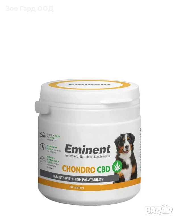 Eminent Chondro CBD е специално разработена натурална хранителна добавка за кучета, която съчетава доказани съставки за здравето на опорно-двигателната система и противовъзпалителен ефект от CBD масло. Формулата е подходяща както за възрастни, така и за активни и спортни кучета, както и за такива, които започват да проявяват първи признаци на ставна скованост или дискомфорт.