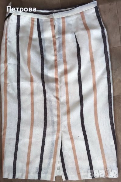 Стилна права пола с подплата, нова, бяла, с жълти и тъмно кафяви ивици, с интересно поставени два волана отпред, естествена материя, пружина отзад 16 см и цепка в средата 24 см. Обикновено шлица се прави, за да улесни ходенето при полите, прибрани по краката, но те придават и особена сексапилност на дрехата. Страхотна пола! Талия 74 см, ханш 100 см, дължина на полата 74 см. Цена 20 лв. Изпраща се с 10% намаление от общоприетата куриерска такса.