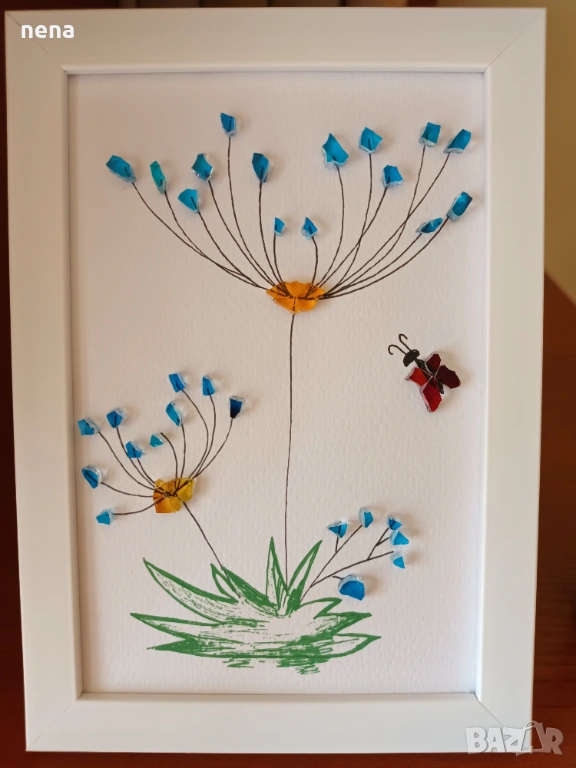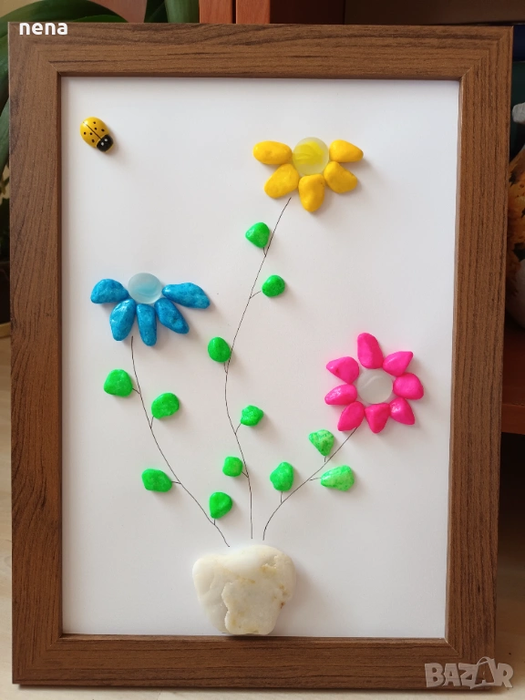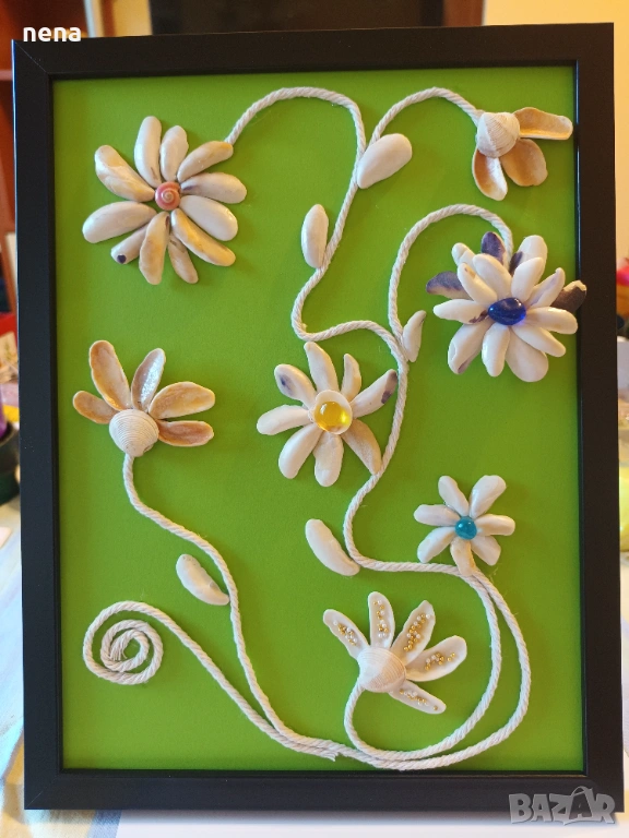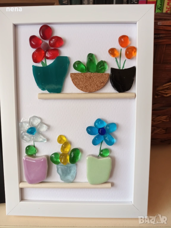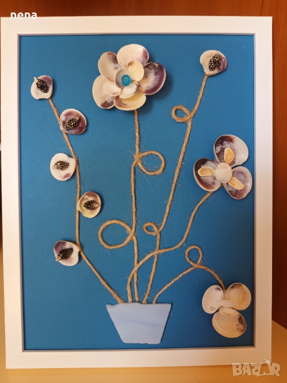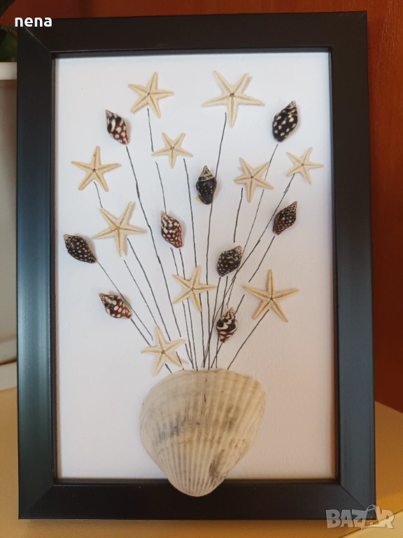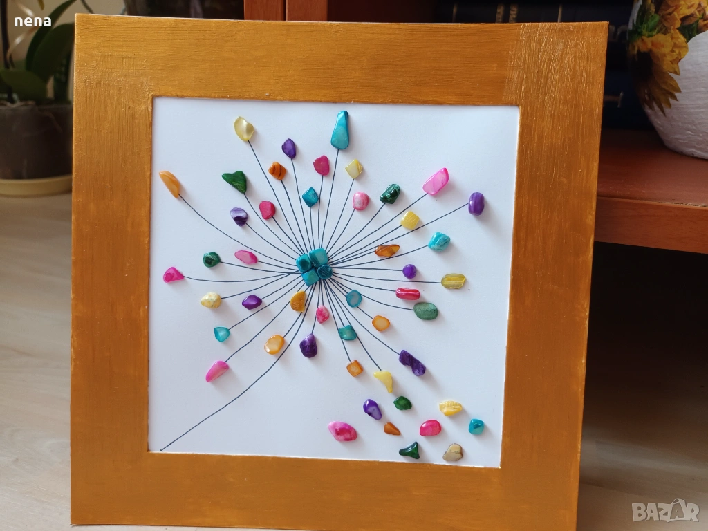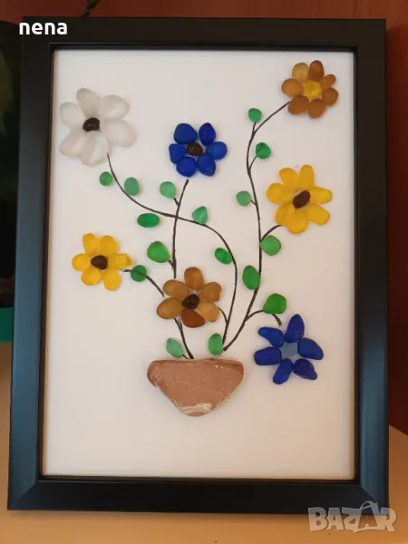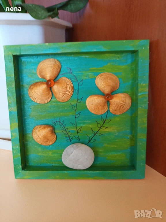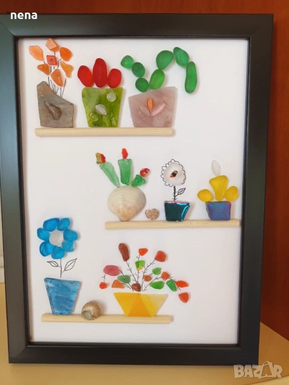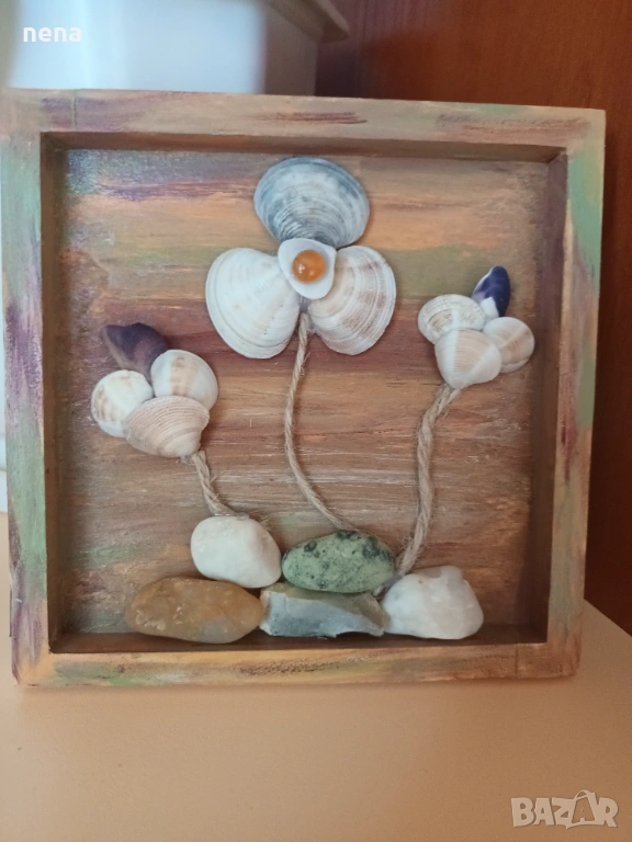 Оригинален подарък за хубави поводи. Пана от мидички, камъчета, стъкълца и други материали. Уникални са, защото никое не може да бъде точно повторено. Мога да изработя и по ваше желание с надписи, дати, имена и т.н. Размерите и цените са различни. Не се притеснявайте да питате. Разгледайте и другите ми подобни обяви. Поздрави!!!