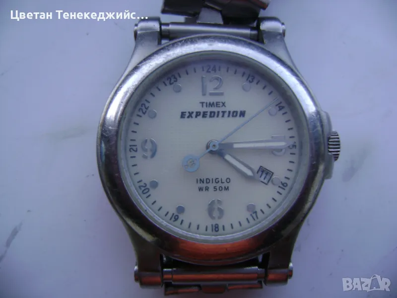 2.Унисекс часовник Timex Expedition Indiglo.Работи точно.Датник.При натискане на коронката осветява циферблата.Водоустойчив-50м.Фосфорни стрелки.Метална верижка.Диаметър на касата без коронката-30,2мм.Метална верижка-35лв.Продаден.