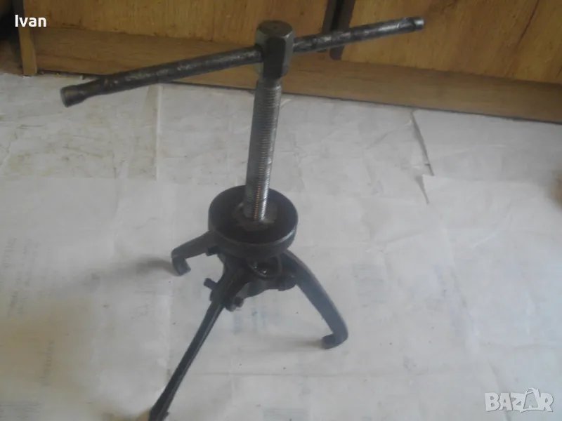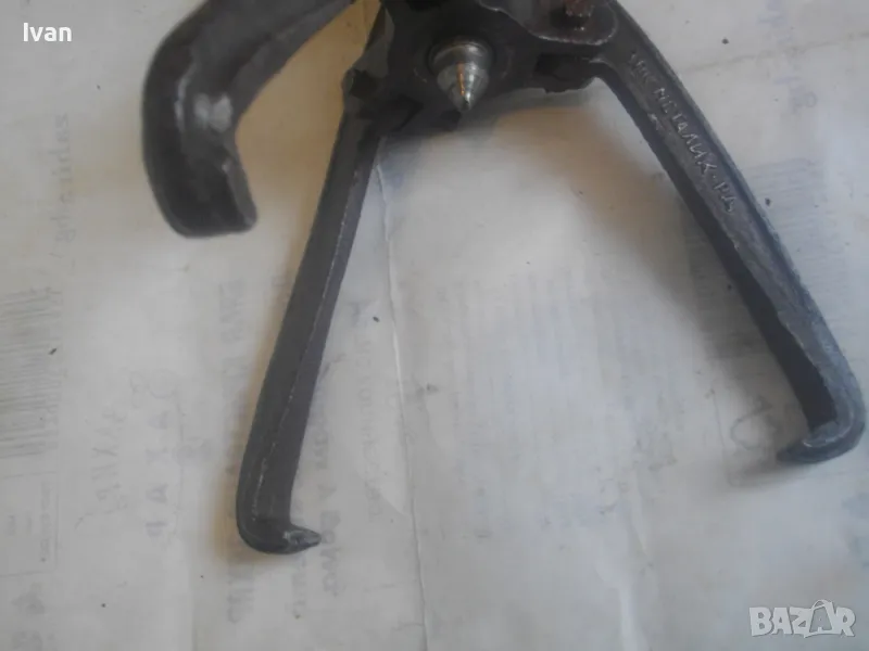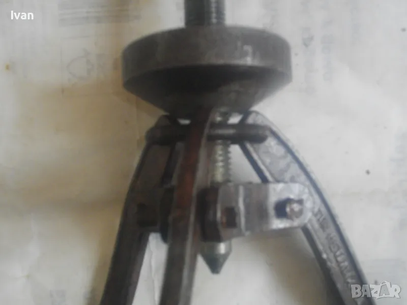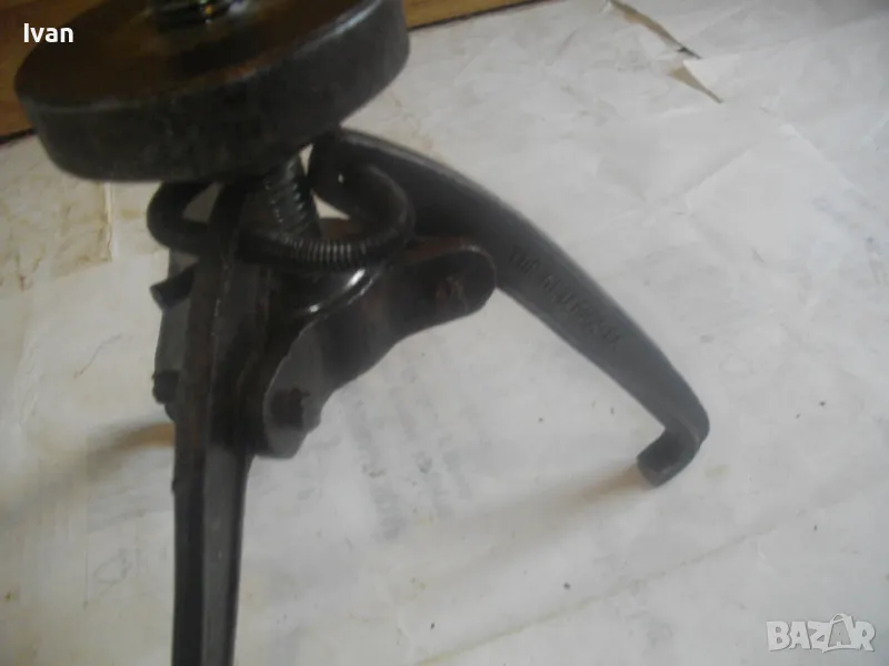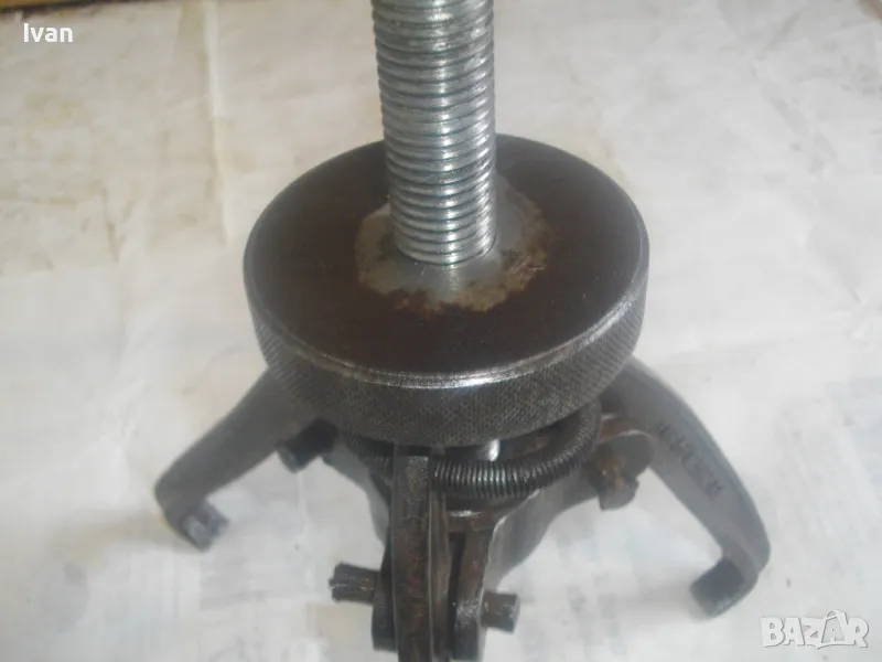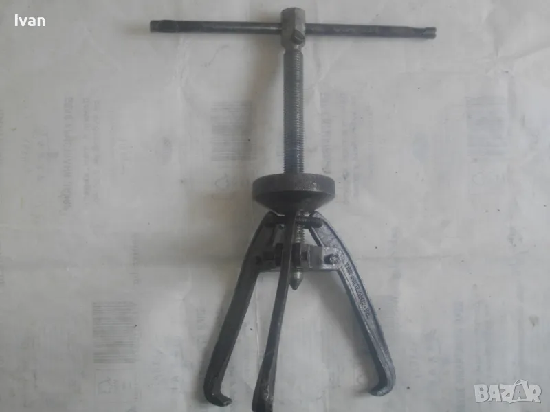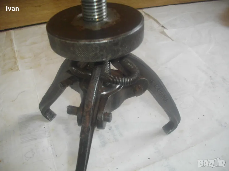 Голяма, масивна, трираменна скоба за вадене на лагери, старо Соц българско производство от годините на НРБ. Маркировка производител - ТПК Металик - гр.Разград. Скобата е от масивна плътна инструментална закалена стомана, от стария материал. Скобата е висок клас Соц производство. Маркировки ТПК Металик Р-Д ст40 - 150 - 20лв. Трираменна, масивна. Плътно дебело желязо на рамената. Захват за вадене на лагери 40-150 мм. Дължина от главата на рамената до до долу - 23 см. Дължина на винта изцяло - 28 см. Пружини на рамената за бърз захват. Захват отгоре на винта - квардарт М24 с прорези за върток. Оригиналният върток с дължина 29 см е наличен. Цялостна дължина на скобата с изцяло отворен винт 40 см. Разстояние между отделните челюсти рамена - 10 см. Захват на лагери до ф150мм. Скобата е почти нова, в добро работно състояние. Пружинния механизъм отваря и затваря съвсем леко, без никакво запъване. Винтовият механизъм има леко износване на резбата по средата на винта и на това място /около 2 см/върви тежко, по останалата дължина на винта резбата върви съвсем леко и бързо. Масивен метален стопер кръгъл над рамената. Тегло на скобата - 3,0 кг.
